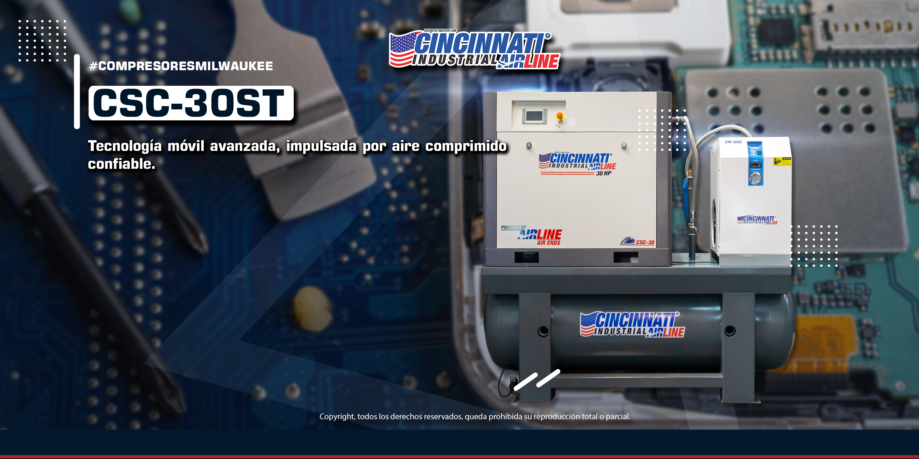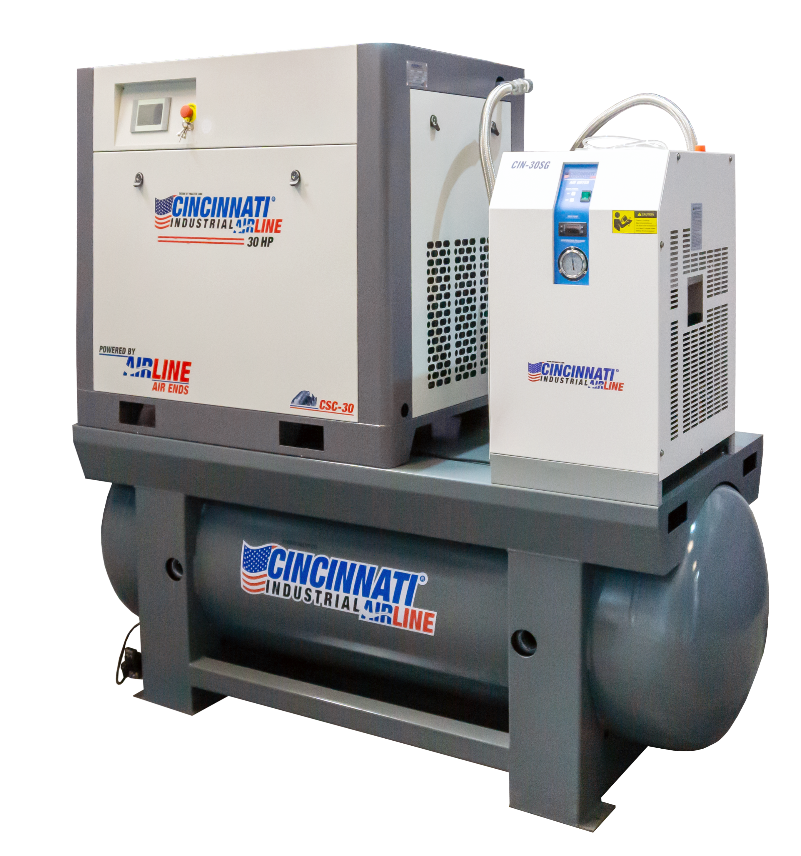 Secado de aire de alto rendimiento: El secador refrigerativo integrado (modelo CIN-30SG) procesa el alto volumen de aire utilizando refrigerante ecológico R410A, eliminando la humedad para proteger maquinaria automatizada costosa y herramientas neumáticas de precisión.