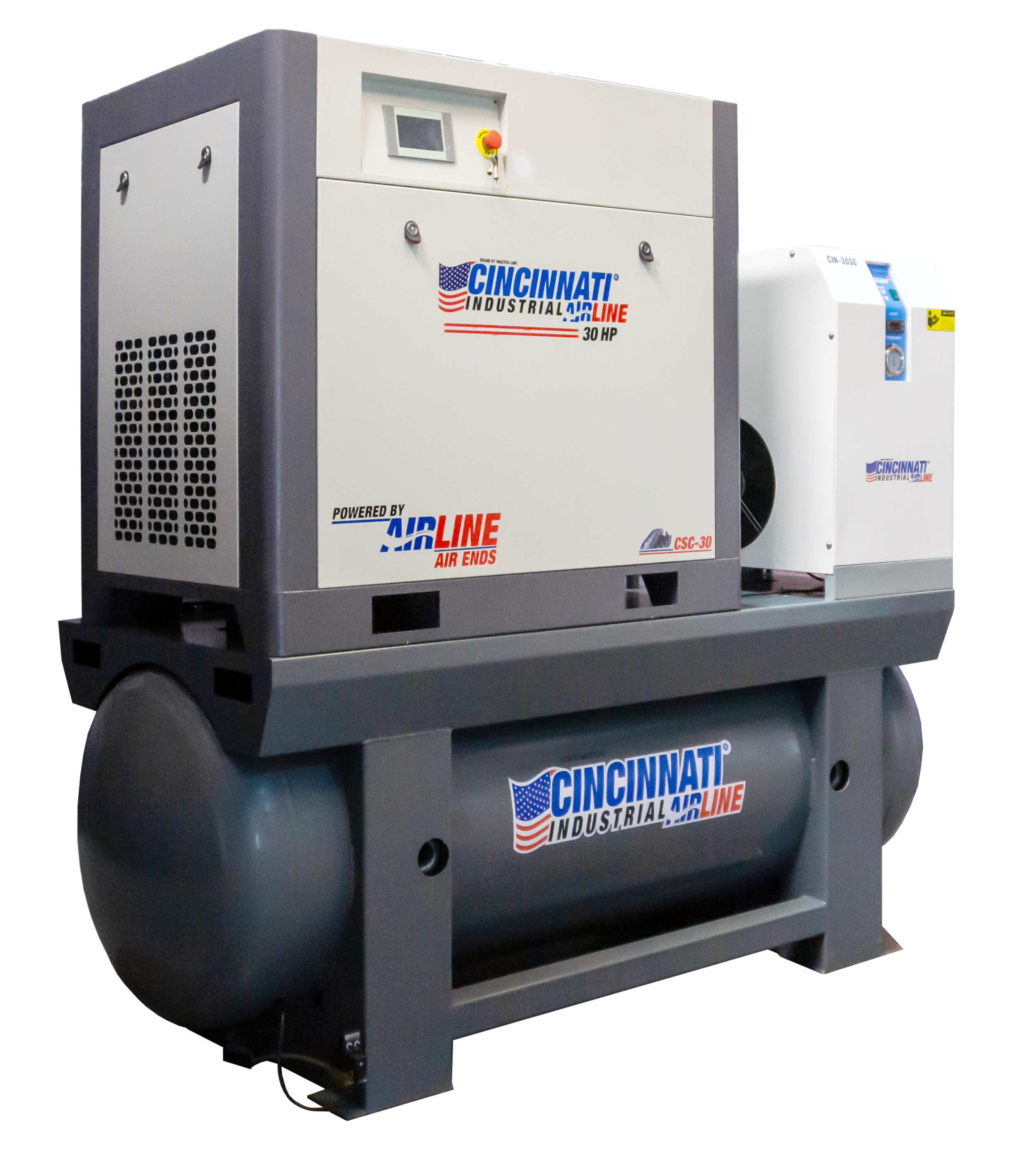 Secado de aire de alto rendimiento: El secador refrigerativo integrado (modelo CIN-30SG) procesa el alto volumen de aire utilizando refrigerante ecológico R410A, eliminando la humedad para proteger maquinaria automatizada costosa y herramientas neumáticas de precisión.